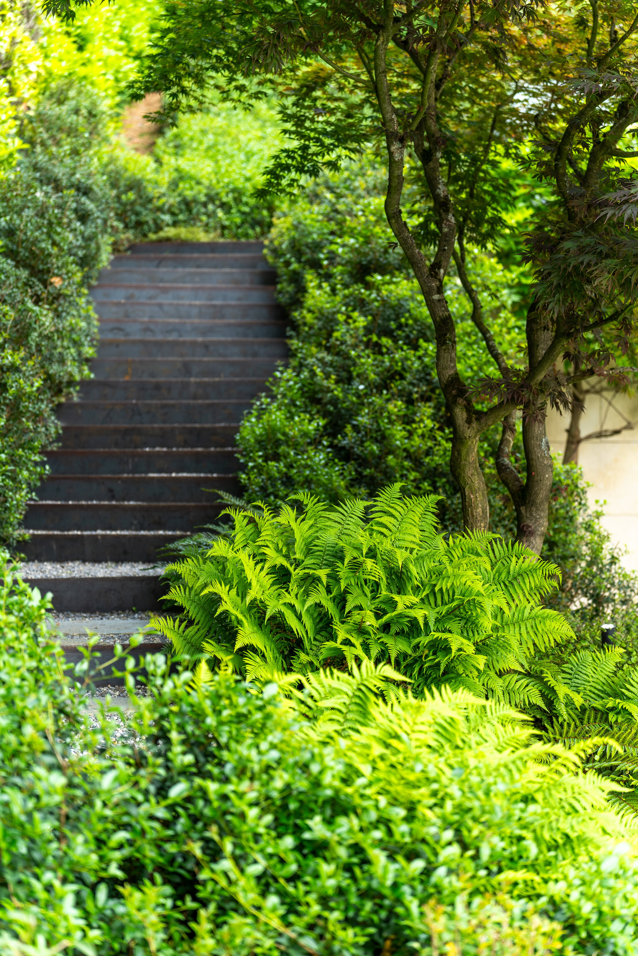 Le parcours se déploie à travers des escaliers intégrés dans des masses végétales généreuses, encadrés par des soutènements en acier corten et enrochements naturels, matériaux nobles qui ancrent le jardin dans son environnement tout en apportant une touche contemporaine.