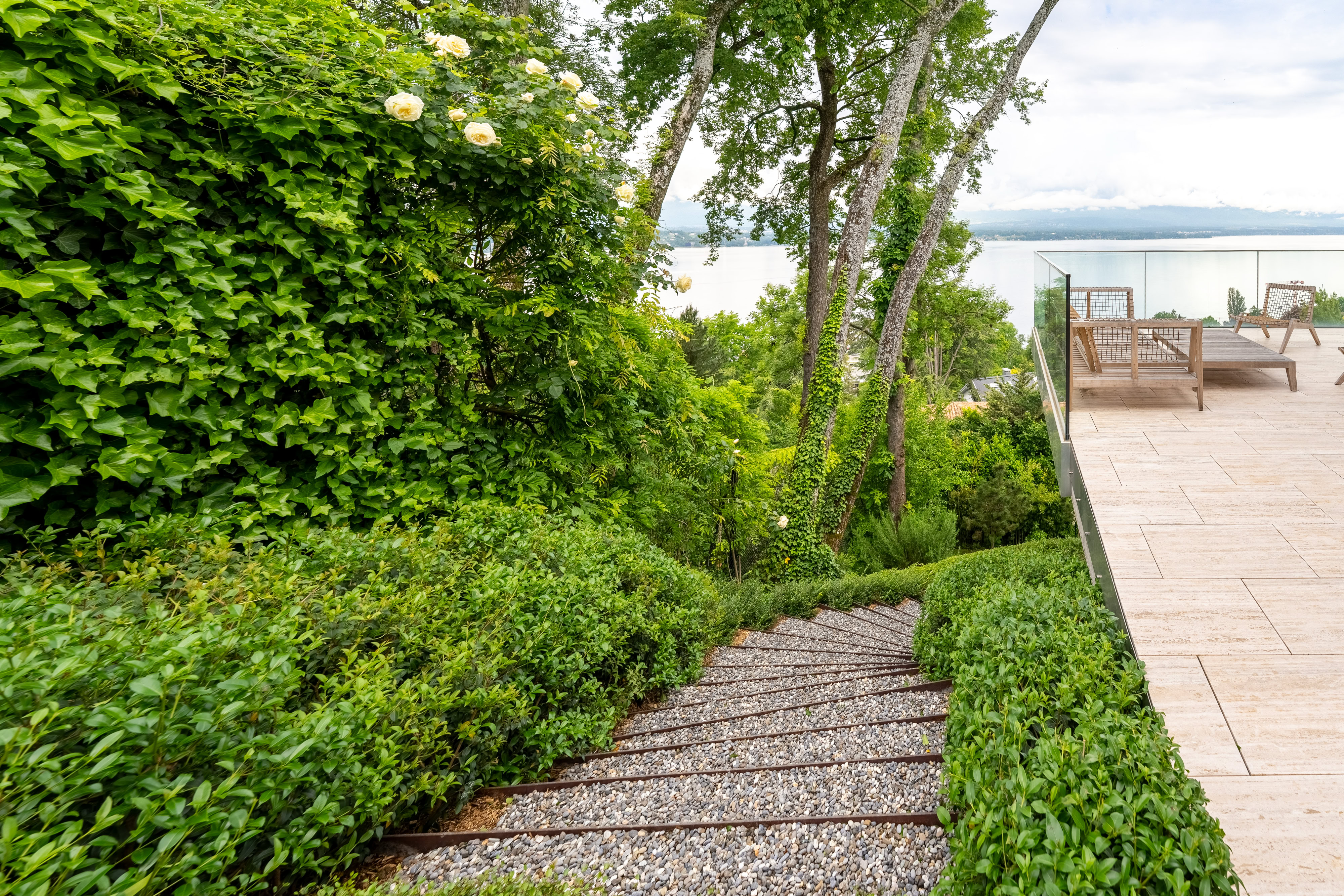 Conçu par les architectes paysagistes de Pottu & Seitz en collaboration avec Nocea Architecture, et réalisé par nos équipes création, ce jardin de 1’300 m² à Cologny s’élève en terrasses pour offrir une vue panoramique sur le lac. Un cadre exceptionnel qui dialogue avec l’architecture épurée de la maison moderne. La végétation, dense et structurée (arbres, arbustes et vivaces) apporte des teintes de verts subtils, sublimant les lignes architecturales tout en créant des espaces intimes et protégés.