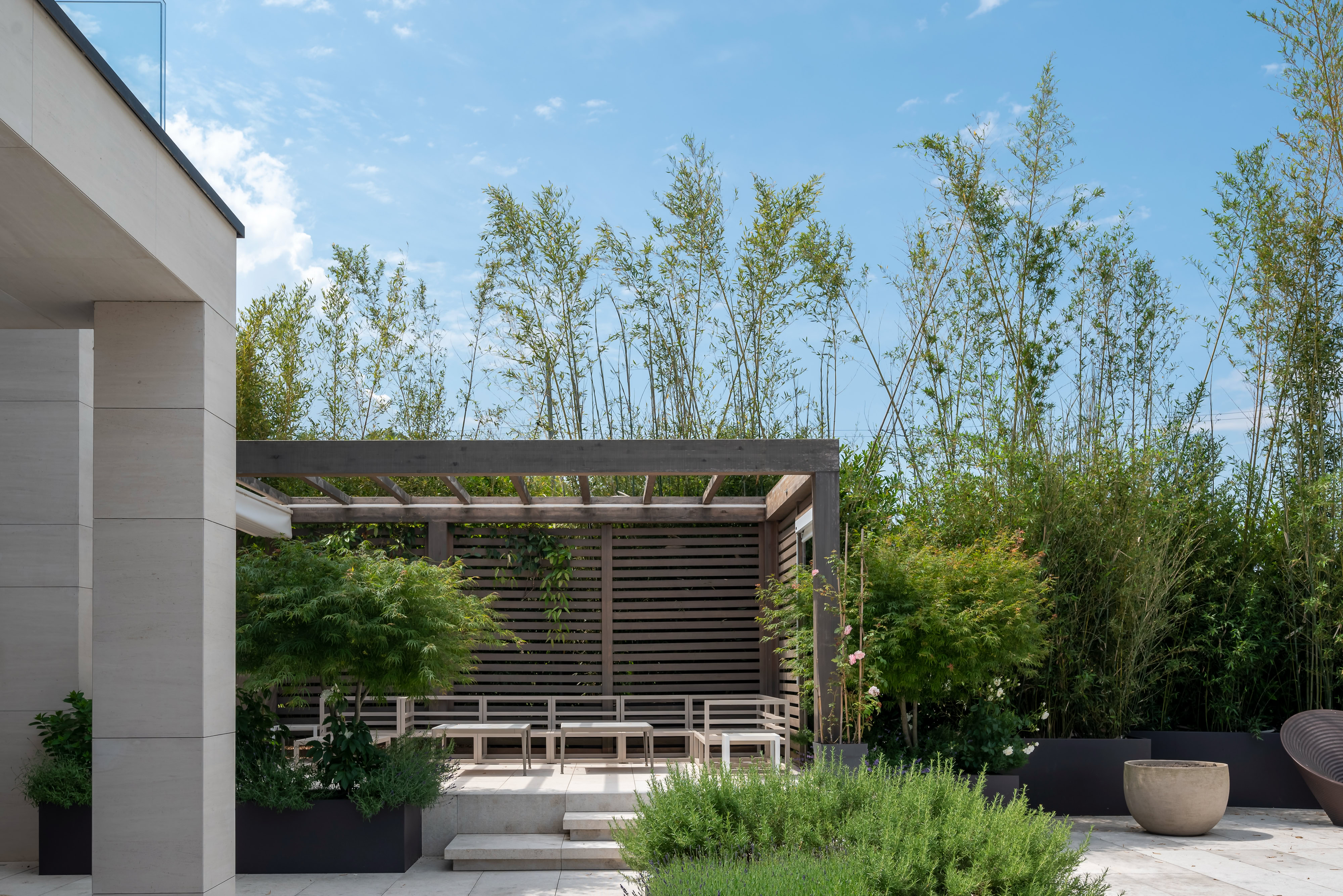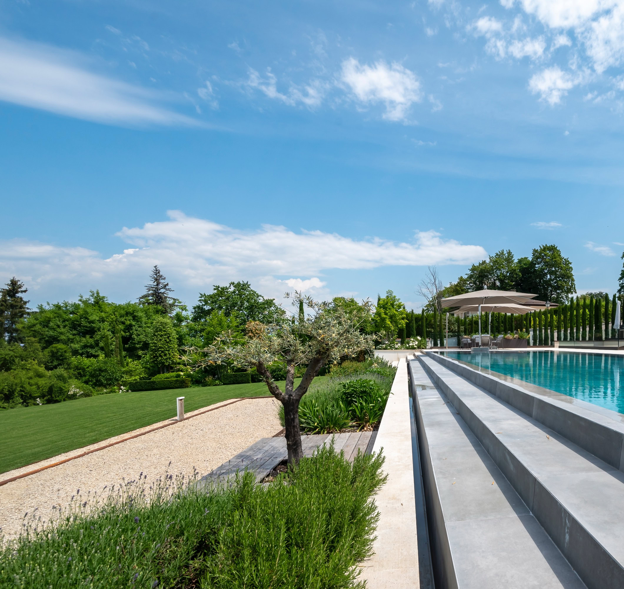 Réalisé par Pottu & Seitz en collaboration avec Les Ateliers Lacroix, ce jardin moderne de 2’200 m² à Cologny incarne l’élégance méditerranéenne dans un cadre privé exigeant.