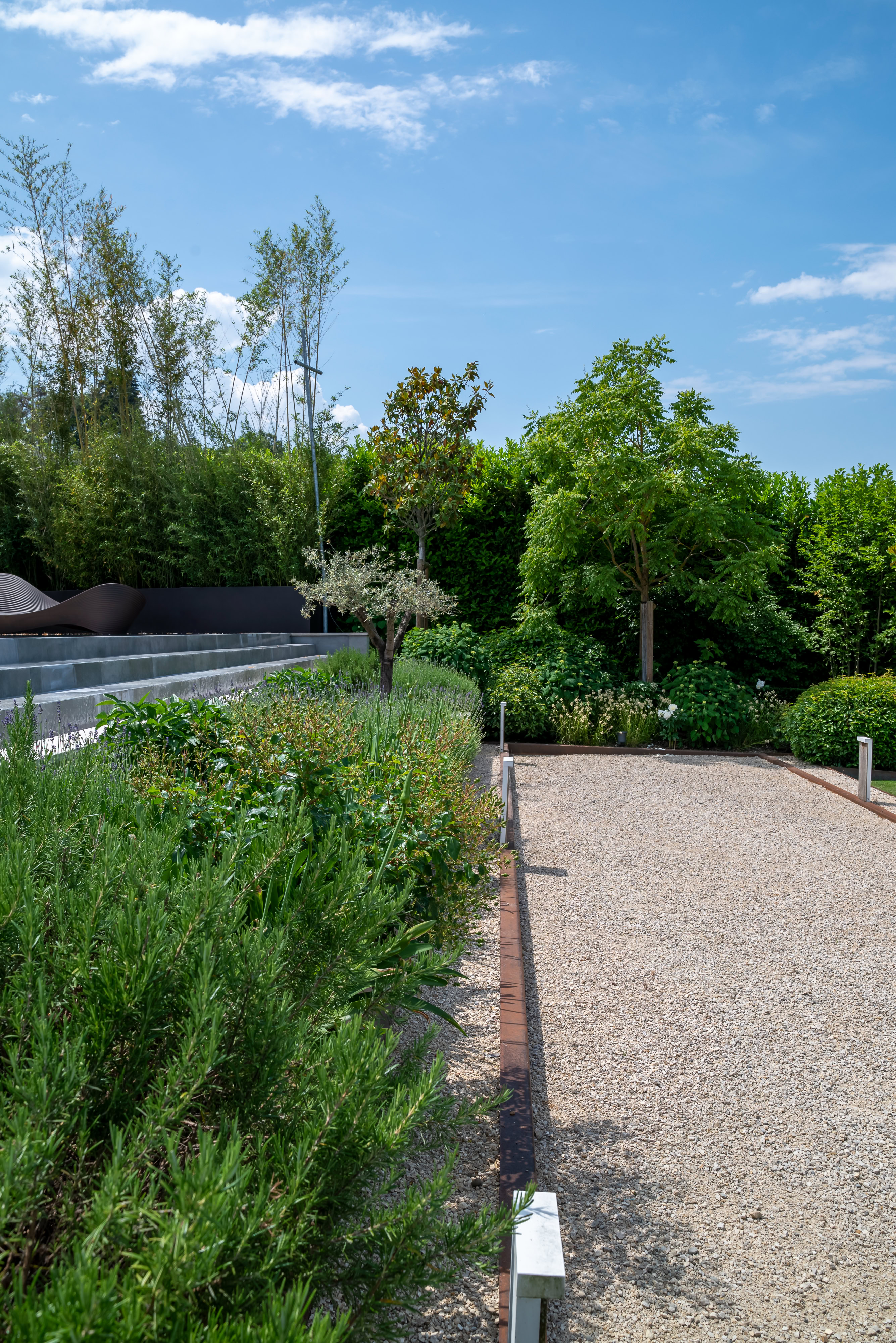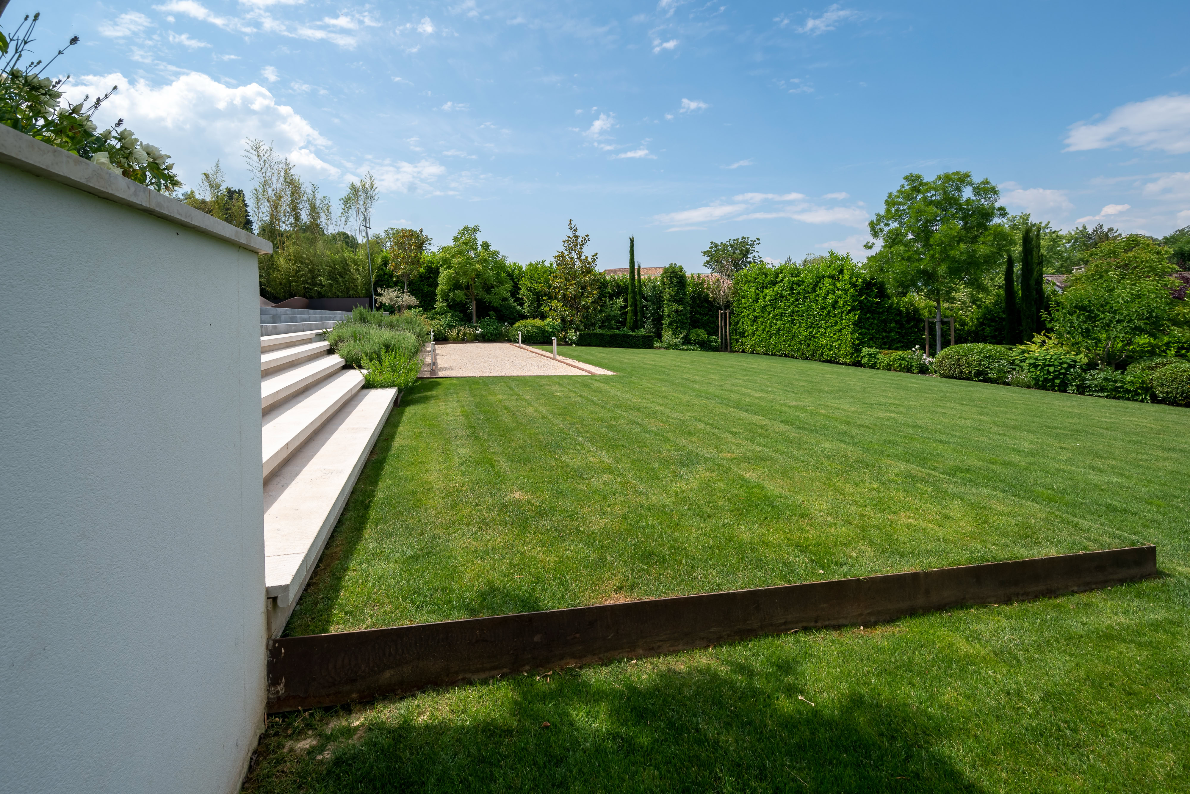 Un coin pétanque et une pergola en bois apportent une touche conviviale et contemporaine, tandis que le gazon de placage, posé avec précision, offre dès l’installation une pelouse dense et uniforme. L’agencement des poteries, l’arrosage automatique et les équipements techniques (électricité, caméras) témoignent d’un savoir-faire intégré, où esthétique et fonctionnalité se rencontrent.