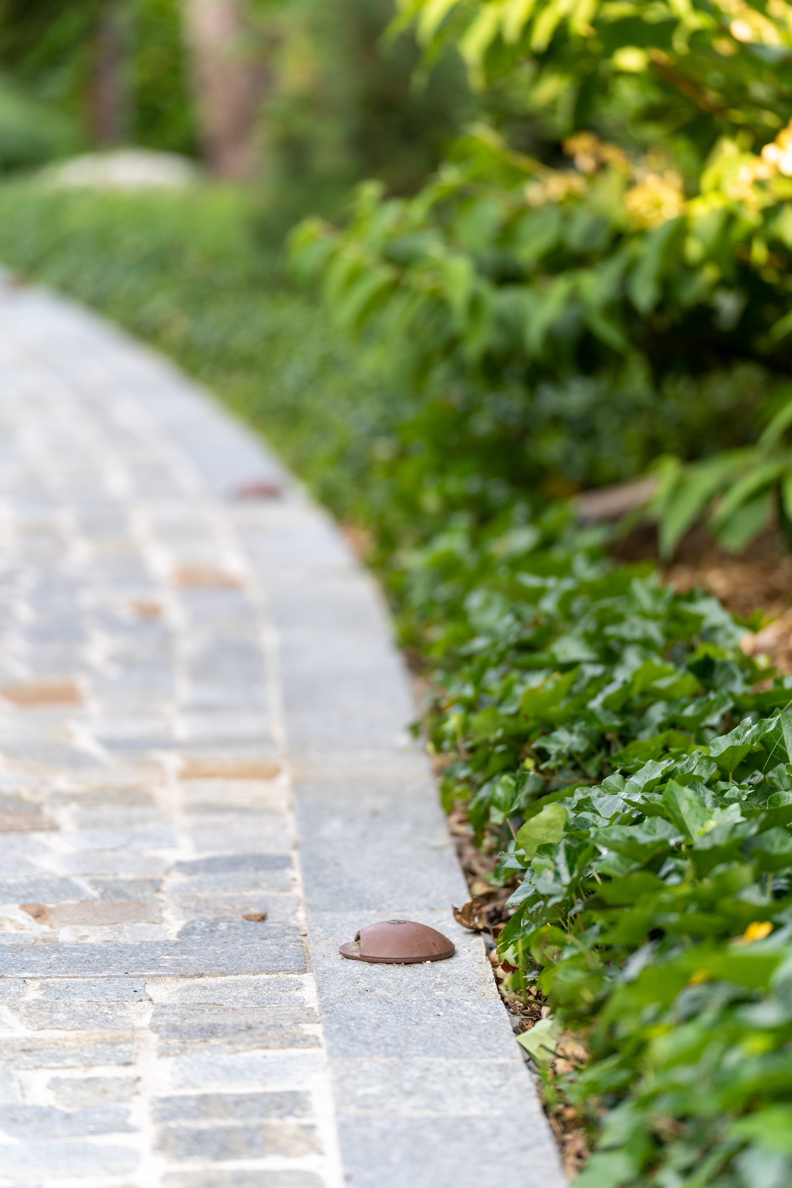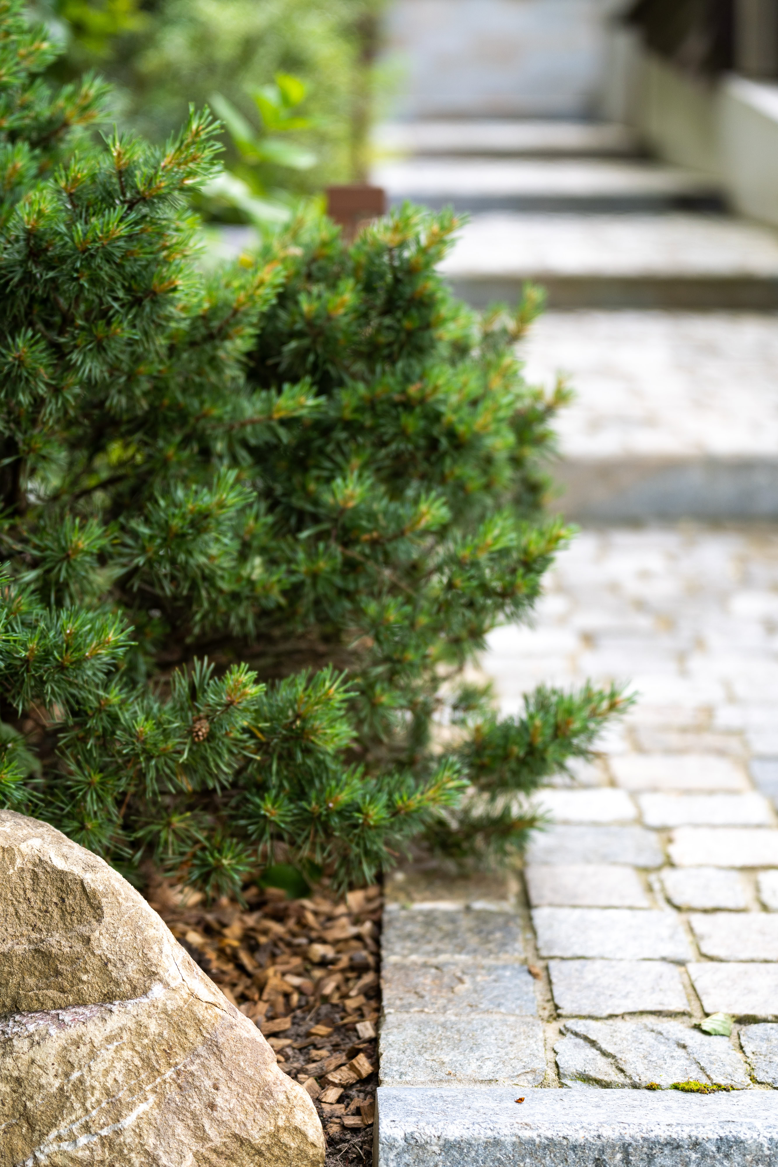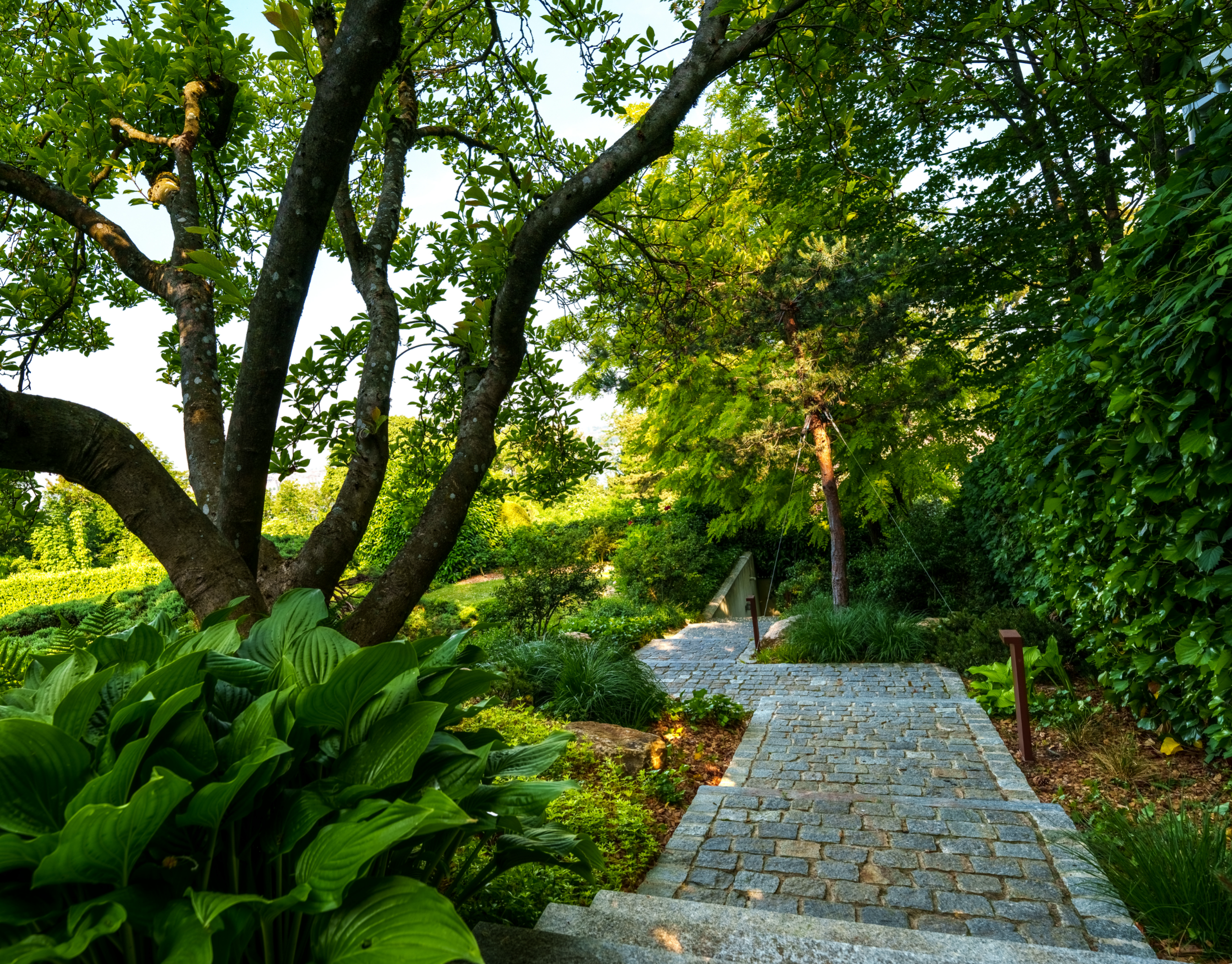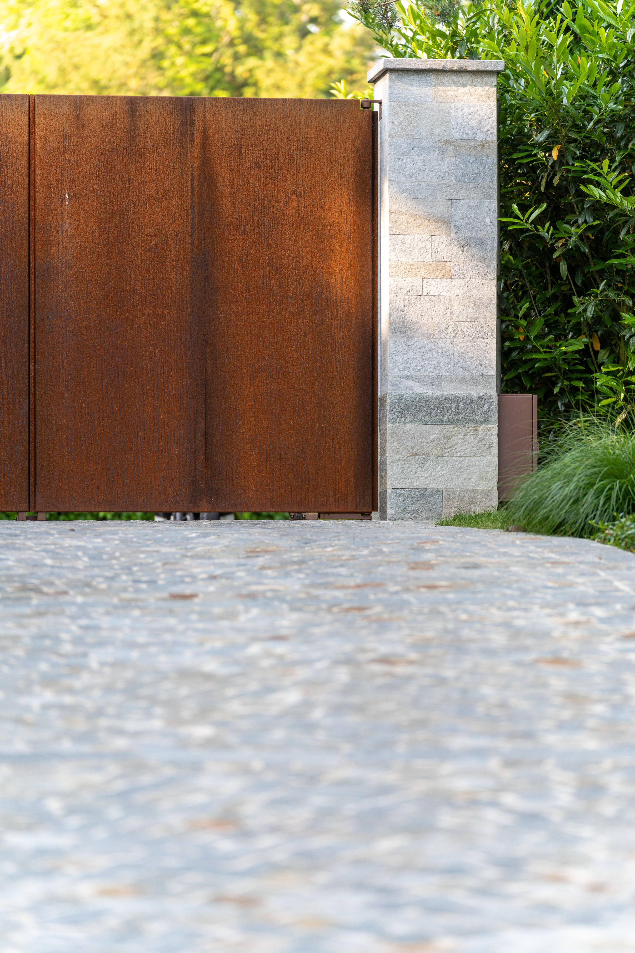 Ce jardin de 2’400m² à Cologny se dévoile uniquement après le franchissement d’un grand portail en acier corten. Une allée de pavés, bordée de plantations, mène à l’espace principal. La minéralité domine (pierre naturelle, pavés en arc, parements, bordures) et s’étend autour de la maison.