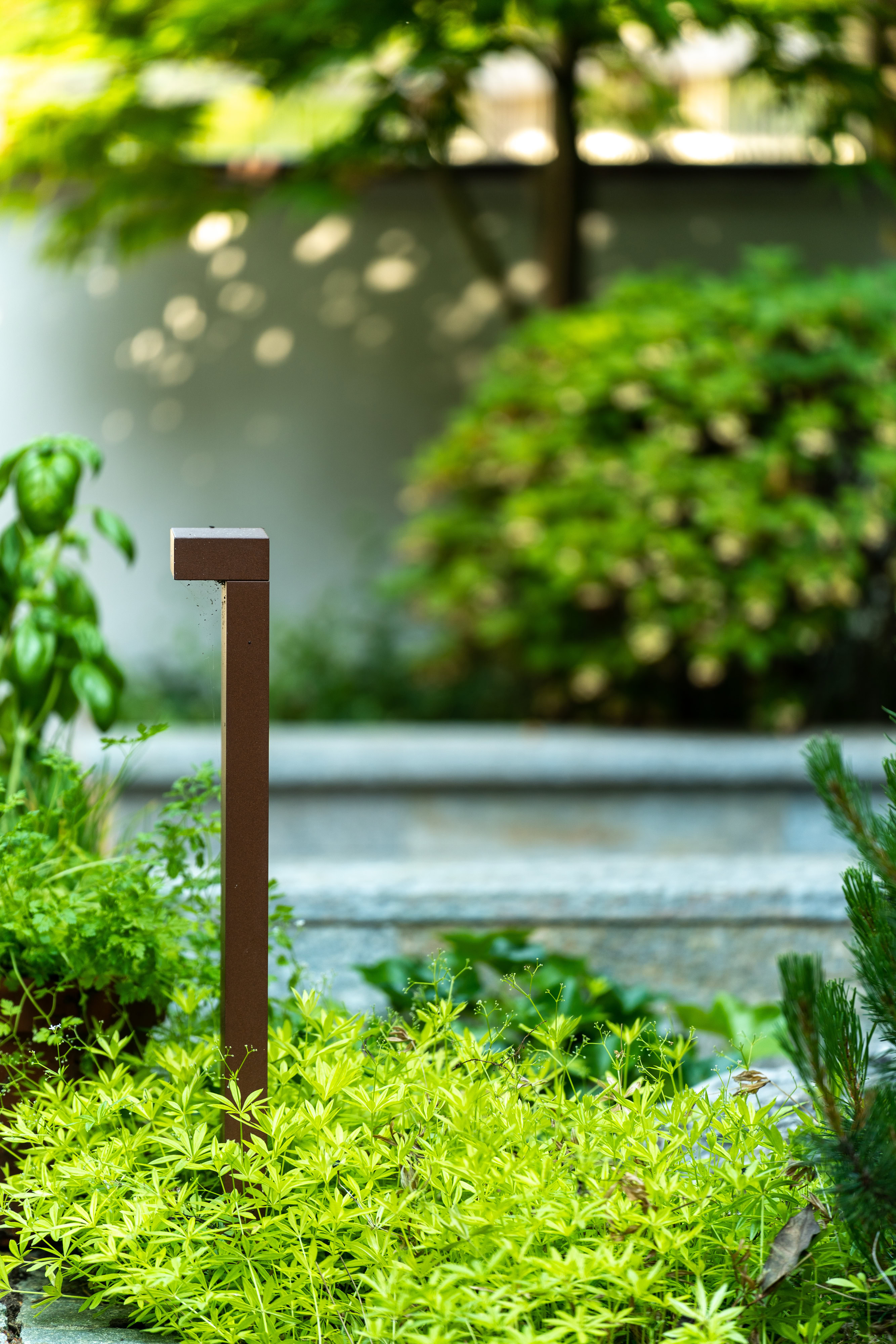 Un escalier intégré à la végétation mène à la terrasse basse. Les éléments d’éclairage reprennent les teintes du corten, créant un dialogue subtil entre matière et lumière. Le jardin s’ouvre ensuite sur un espace plus dégagé, où la végétation s’adapte à l’ombre et à la lumière.