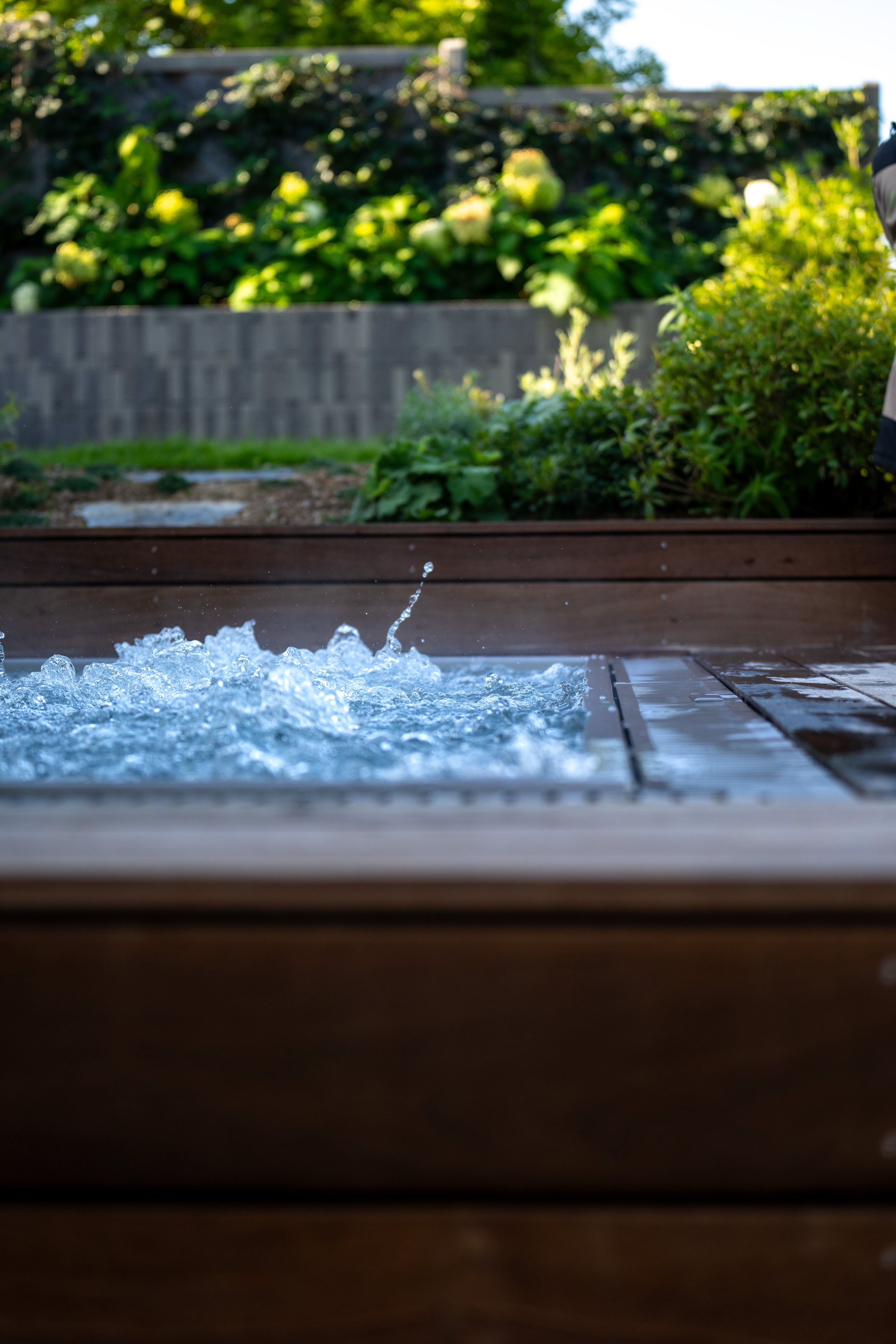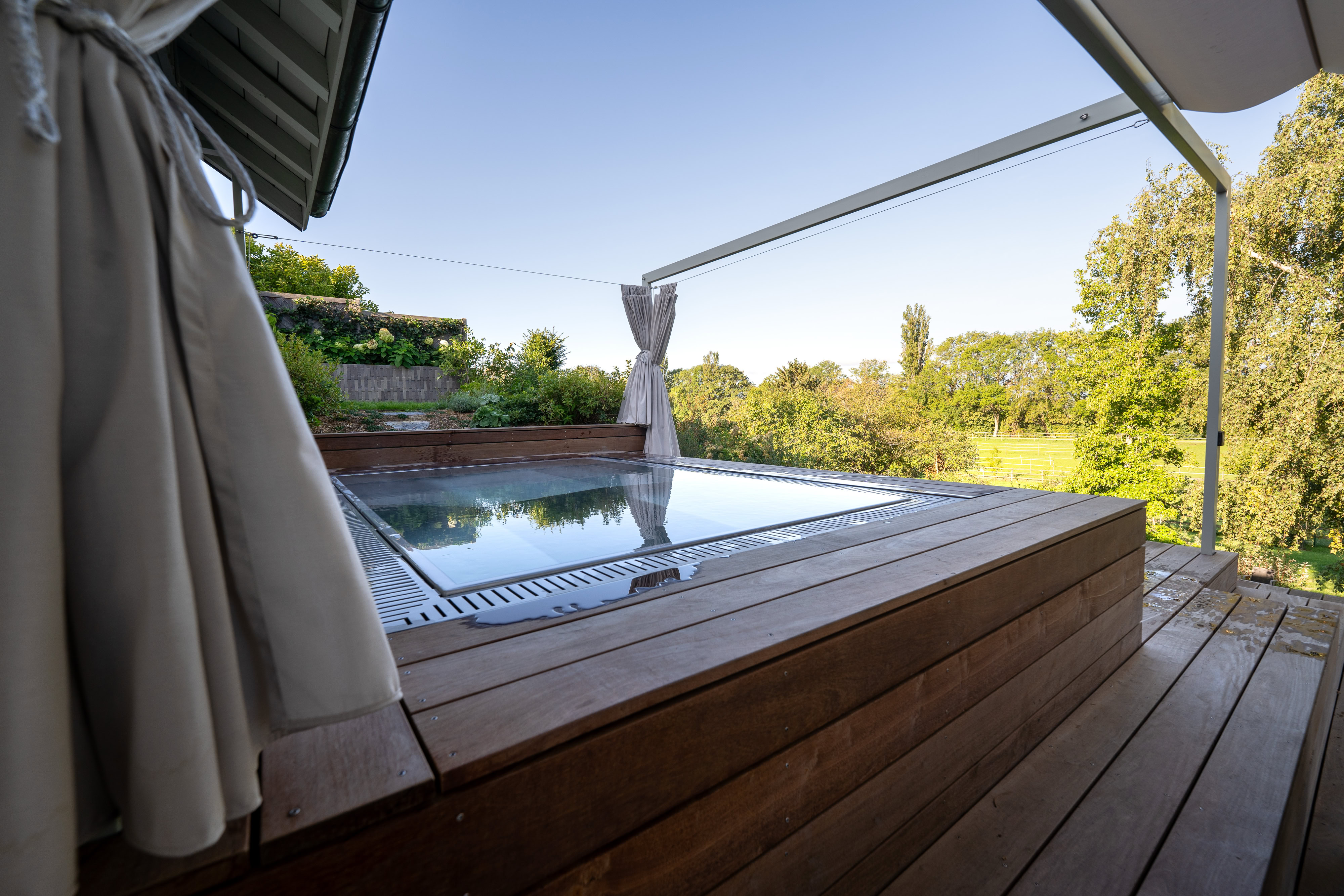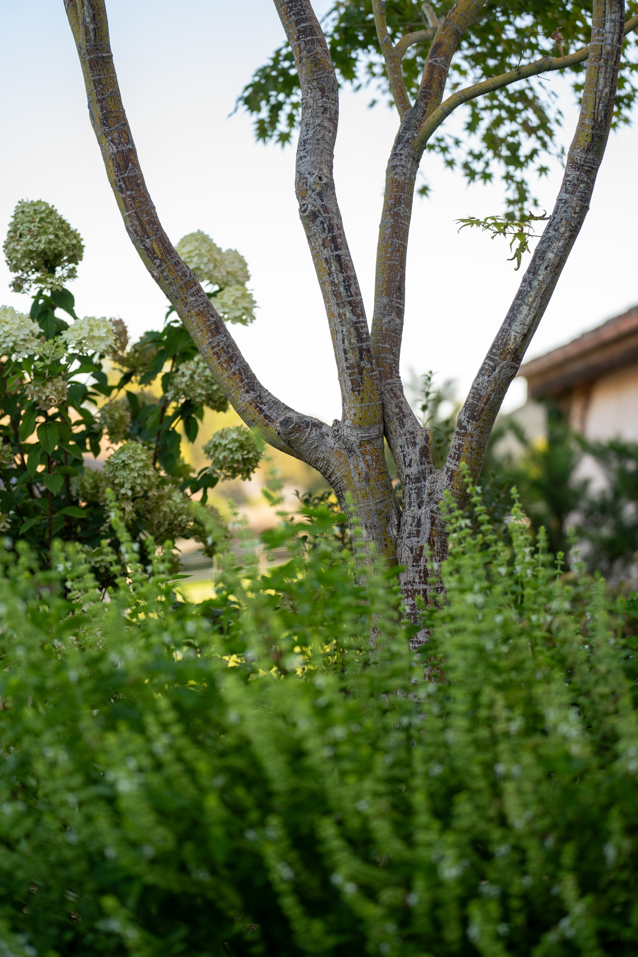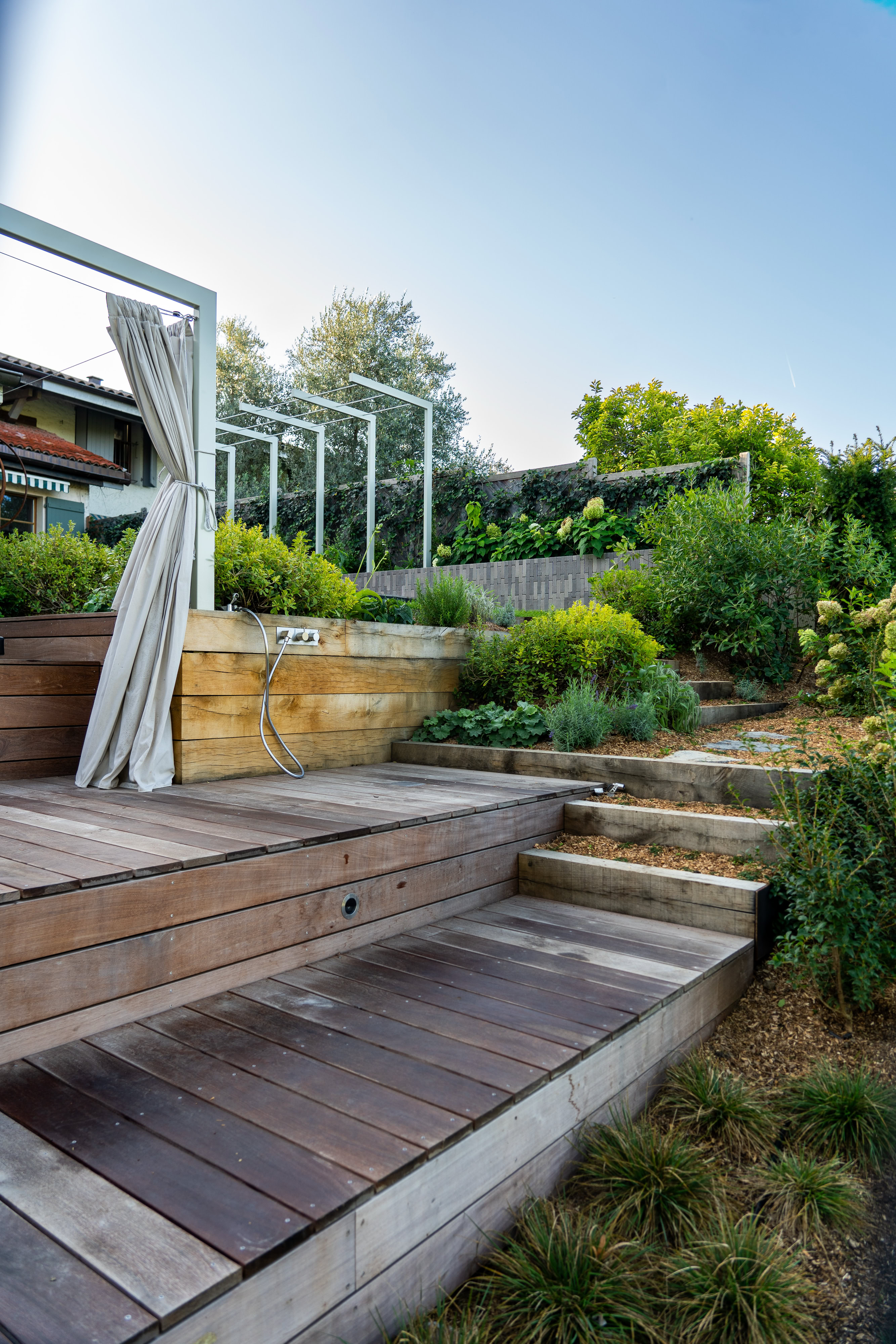 Très étagé, le jardin invite à la promenade : on descend, remonte, puis redescend pour découvrir des terrasses, un SPA extérieur, une cuisine d’extérieur et un salon champêtre en pied d’arbres, tous sublimés par une végétation soignée : arbres, arbustes, massifs de vivaces et gazon de placage posé avec précision.