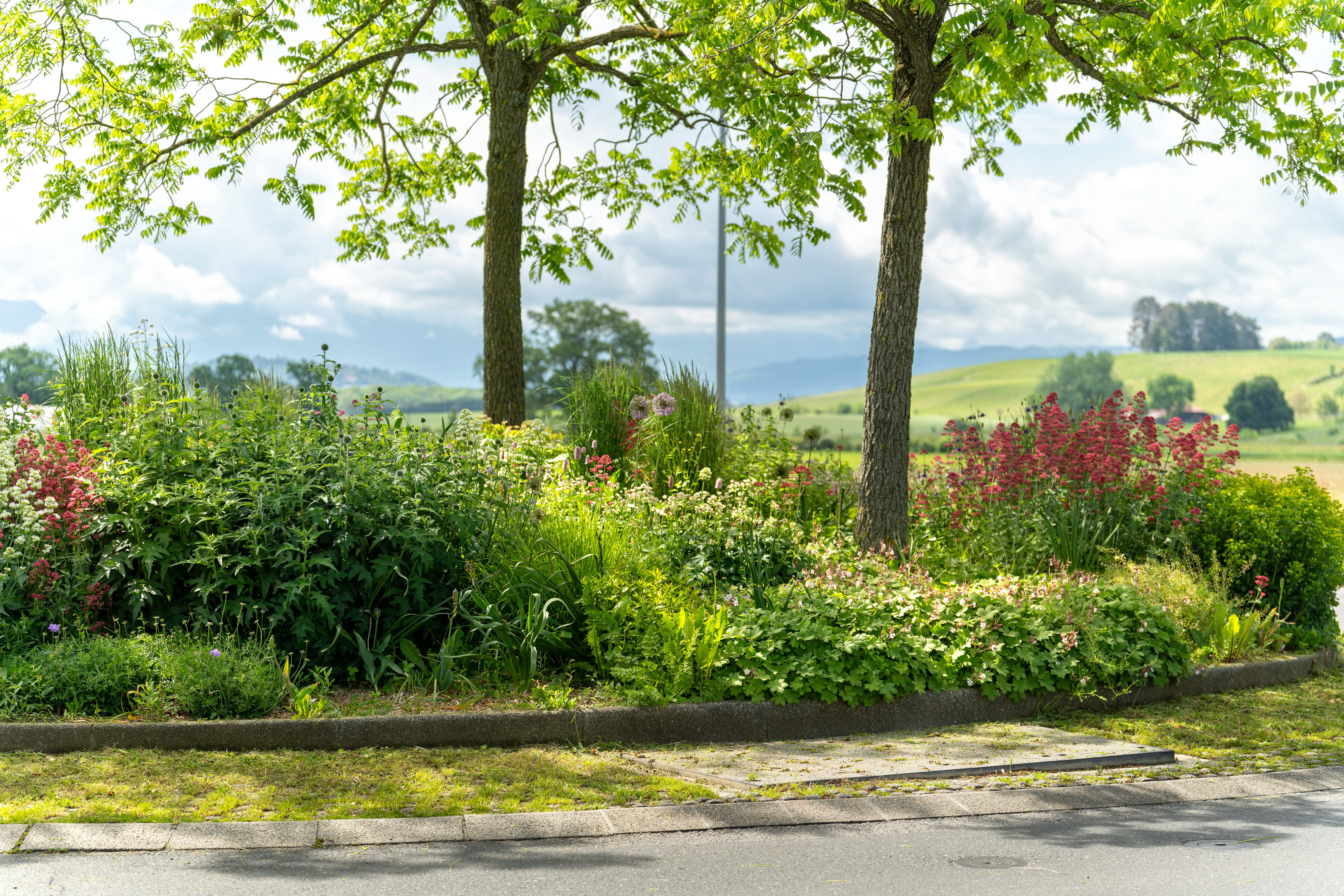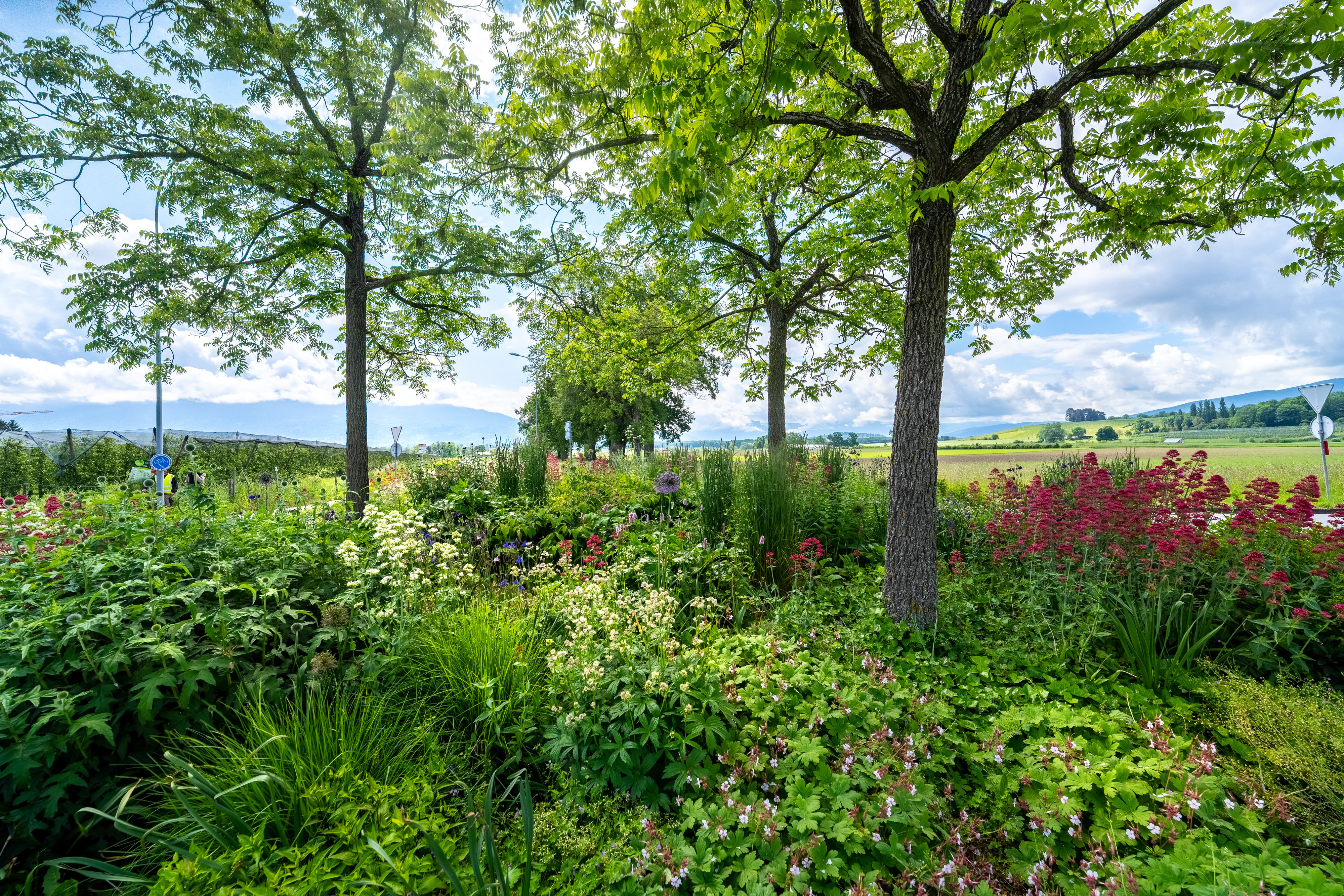 Conçu et réalisé par Pottu & Seitz pour la commune de Meinier, ce projet public de 115 m² réinvente l’espace du rond-point en jouant avec la saisonnalité des vivaces fleuries, sous la canopée des arbres existants conservés. Une approche sensible et durable, où chaque saison apporte une palette de couleurs et de textures nouvelles.