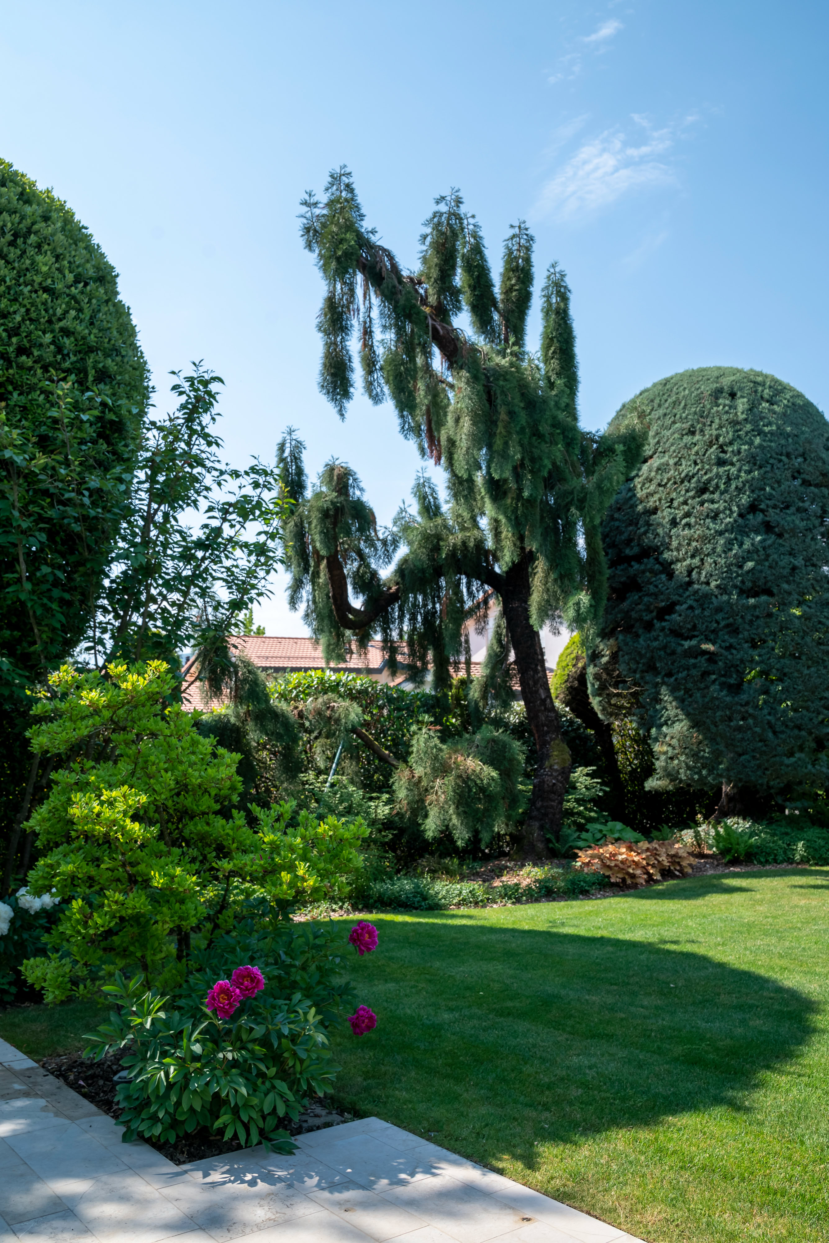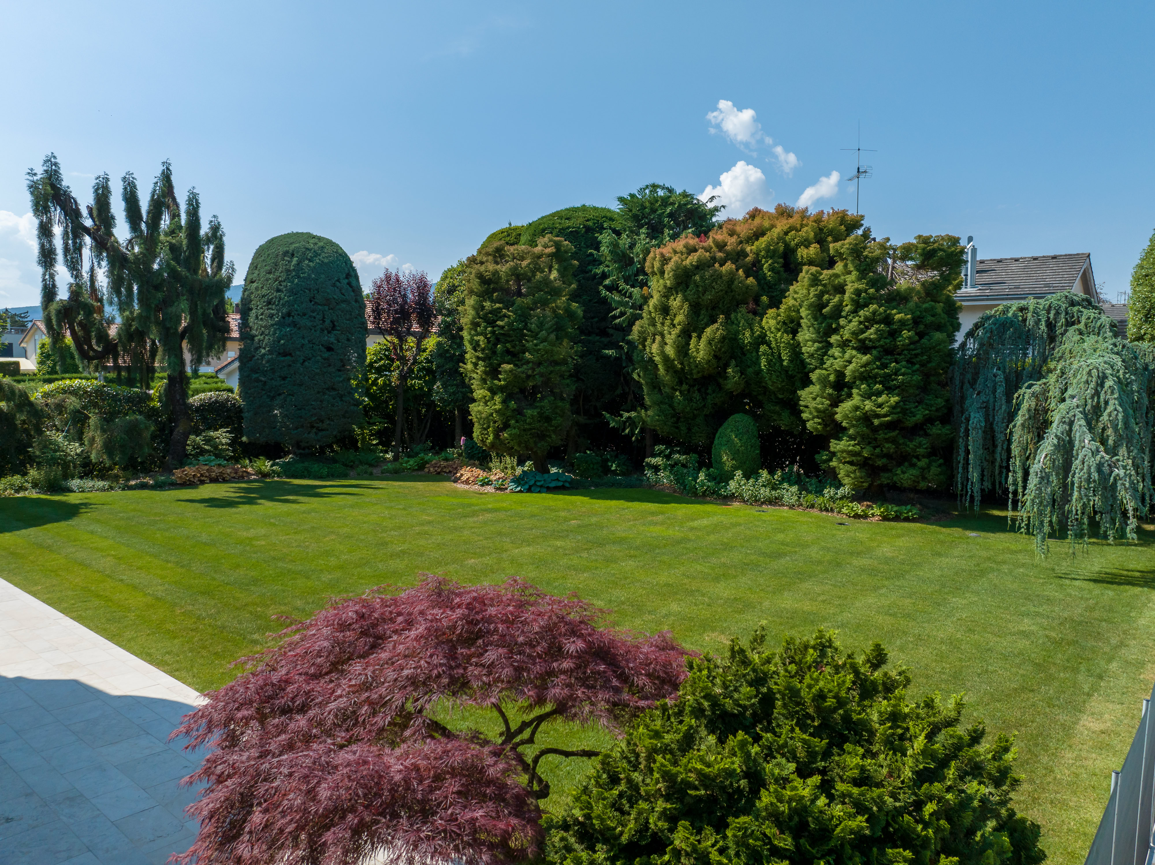 Conçu et réalisé par Pottu & Seitz, ce jardin de 1’500 m² à Cologny repose sur une structure claire et fonctionnelle. Des cheminements minéraux dessinent les parcours, guidant le regard à travers des espaces végétalisés.